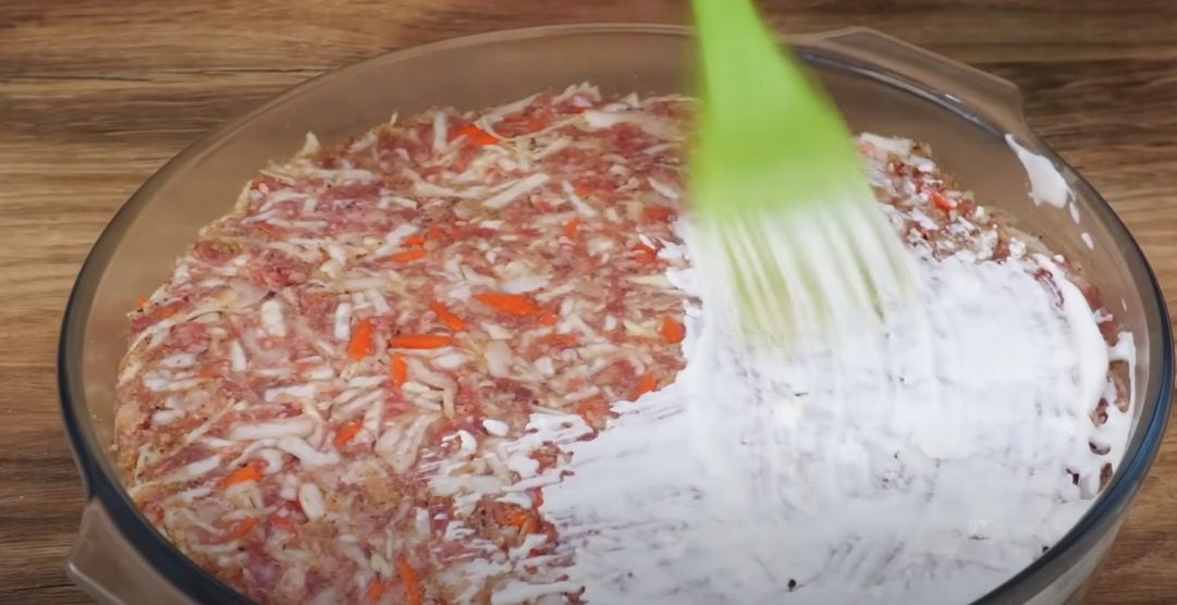Перекладіть все у підготовлену форму. Розрівняйте верх. Сухарі, якими ви присипали форму, приберіть серветкою, а то вони пригорять. Змастіть верх сметаною за допомогою пензлика.