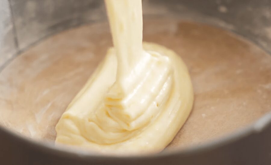 У глибоку миску вбиваємо яйце, додаємо сіль, цукор і ванільний цукор. Все ретельно розтираємо вінчиком. Вливаємо у яєчну суміш рослинну олію без без запаху і перемішуємо. Натираємо цедру одного лимону. Натираємо лише жовту частину шкірки, біла – гірчить. Також видавлюємо сік цілого лимону. Сік і цедру перекладаємо до яєчної маси. Також вливаємо молоко. Все ретельно перемішуємо вінчиком. Засипаємо у рідкі інгредієнти просіяне борошно і розпушувач тіста. Розмішуємо до однорідності. Готове тісто має вийти по консистенції як густа сметана.