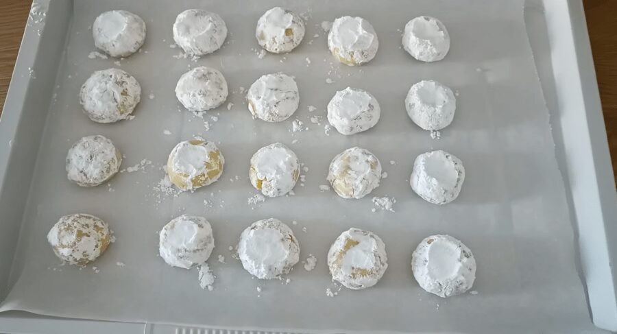 В окрему миску насипаємо цукрову пудру. Тісто відкриваємо і руками формуємо невеликі кульки з тіста. Кожну кульку обвалюємо у цукровій пудрі і перекладаємо на деко застелене пергаментним папером.
