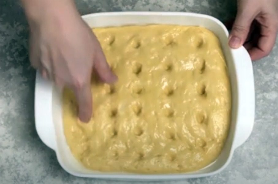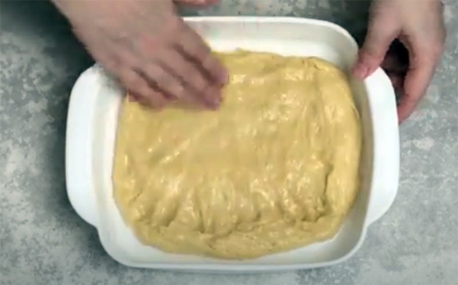 Форму для випікання змастіть олією. Робіть це пальцями, щоб вони змастилися в жиру. Викладіть тісто. Воно липке, тому змащена олією рука легше розподілить його рівномірно.