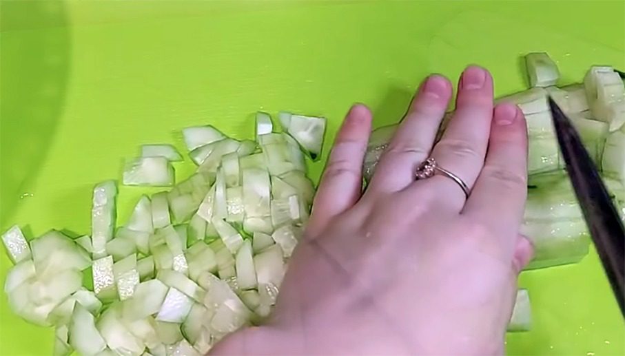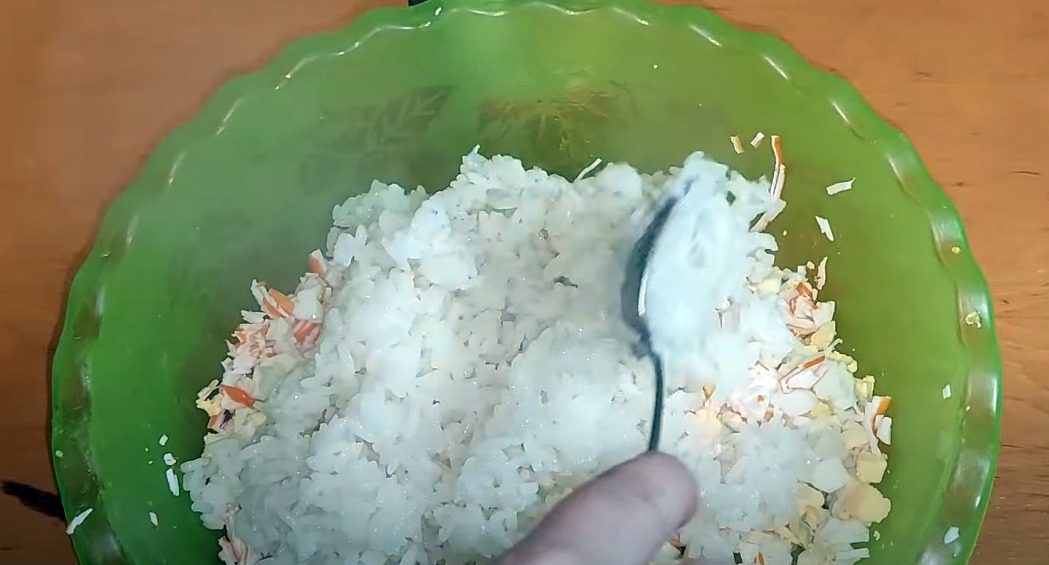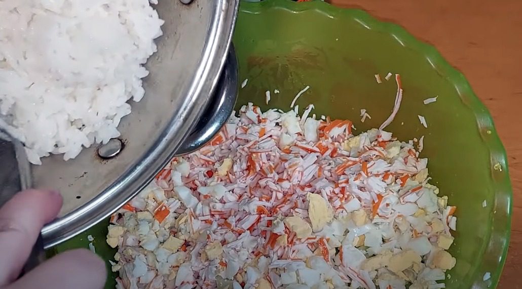 Яйця відваріть протягом 10 хвилин. Перекладіть у холодну воду й дайте прохолонути. Обчистьте шкаралупу. Наріжте на дрібні кубики. З’єднайте з рисом. Огірки промийте, промокніть паперовим рушником. Якщо шкірочка не гірка, зрізати її не потрібно. Наріжте дрібними кубиками. Додайте у миску.