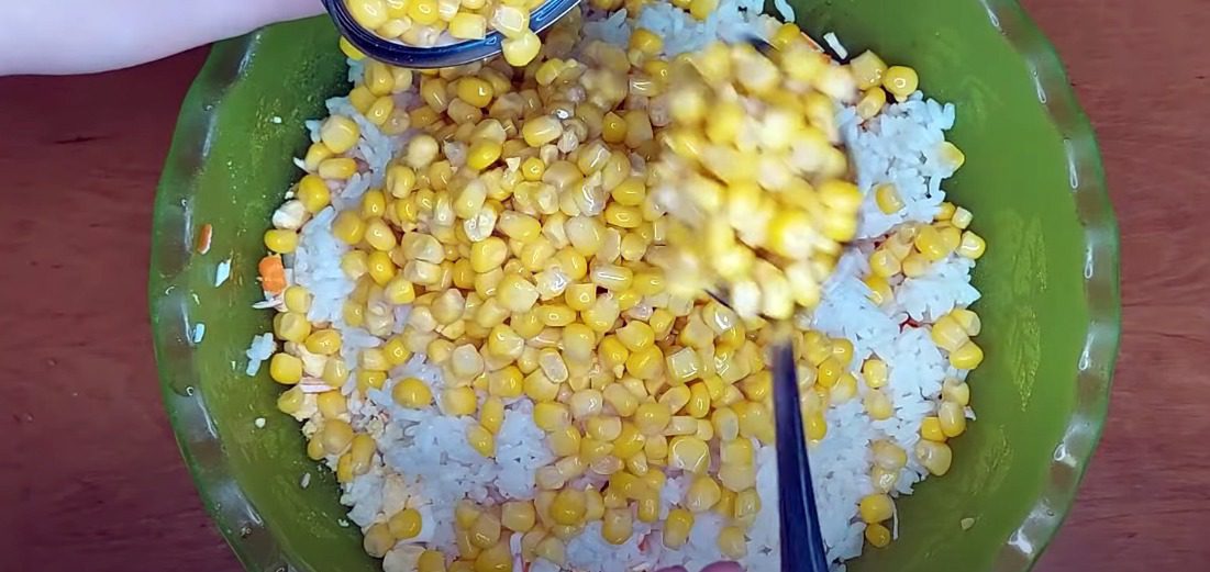 З крабових паличок зніміть плівку. Викладіть їх на дошку і наріжте кубиками. Консервовану кукурудзу з банки відкиньте на друшляк, щоб витекла рідина. Покладіть у салатник до решти.
