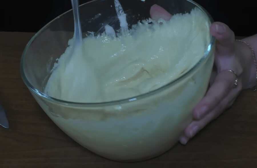Для приготування тіста у глибокій мисці змішайте до однорідності яйця, сметану і майонез. Додаємо до цієї маси просіяне борошно і ретельно перемішуємо, щоб не було грудочок. Готове тісто виходить трішки густіше, ніж класичне тісто на оладки.
