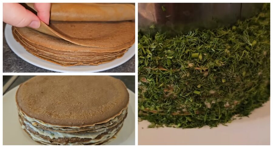 - Далі на кожен млинець викладайте начинку та формуйте торт. Останній корж зверху змастіть просто майонезом, так само як і боки торта. Посипте подрібненою зеленню або проявіть креатив та прикрасьте згідно зі своєю фантазією. Поставте у холодильник на пару годин, а тоді частуйте близьких.