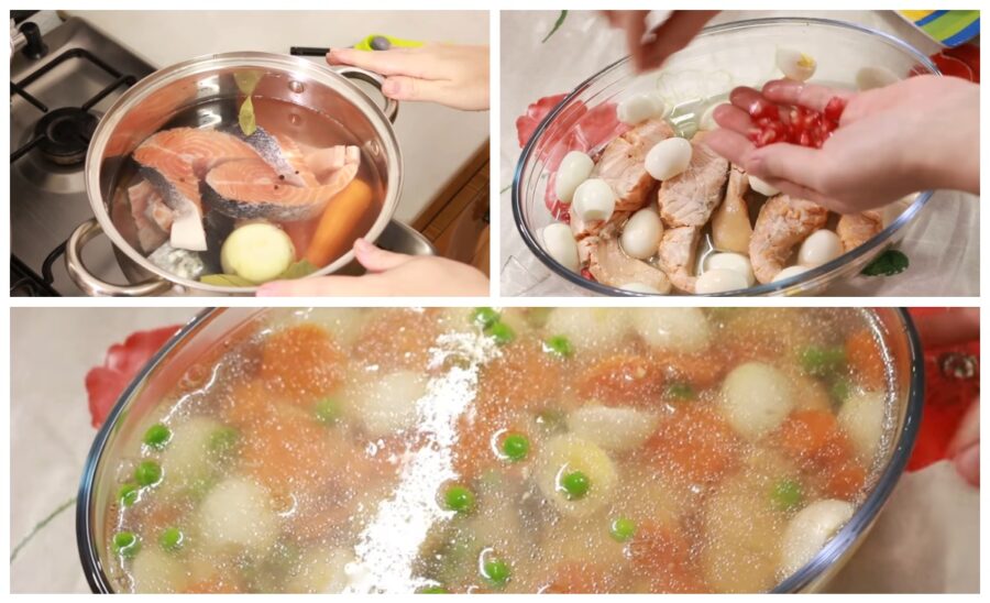 - Спочатку відваріть рибу. Почищену та нарізану на рівні шматки рибу покладіть у каструлю й залийте водою. Додайте відчищену від лушпиння цілу цибулю, чищену моркву, перець горошком, лавровий лист та сіль.