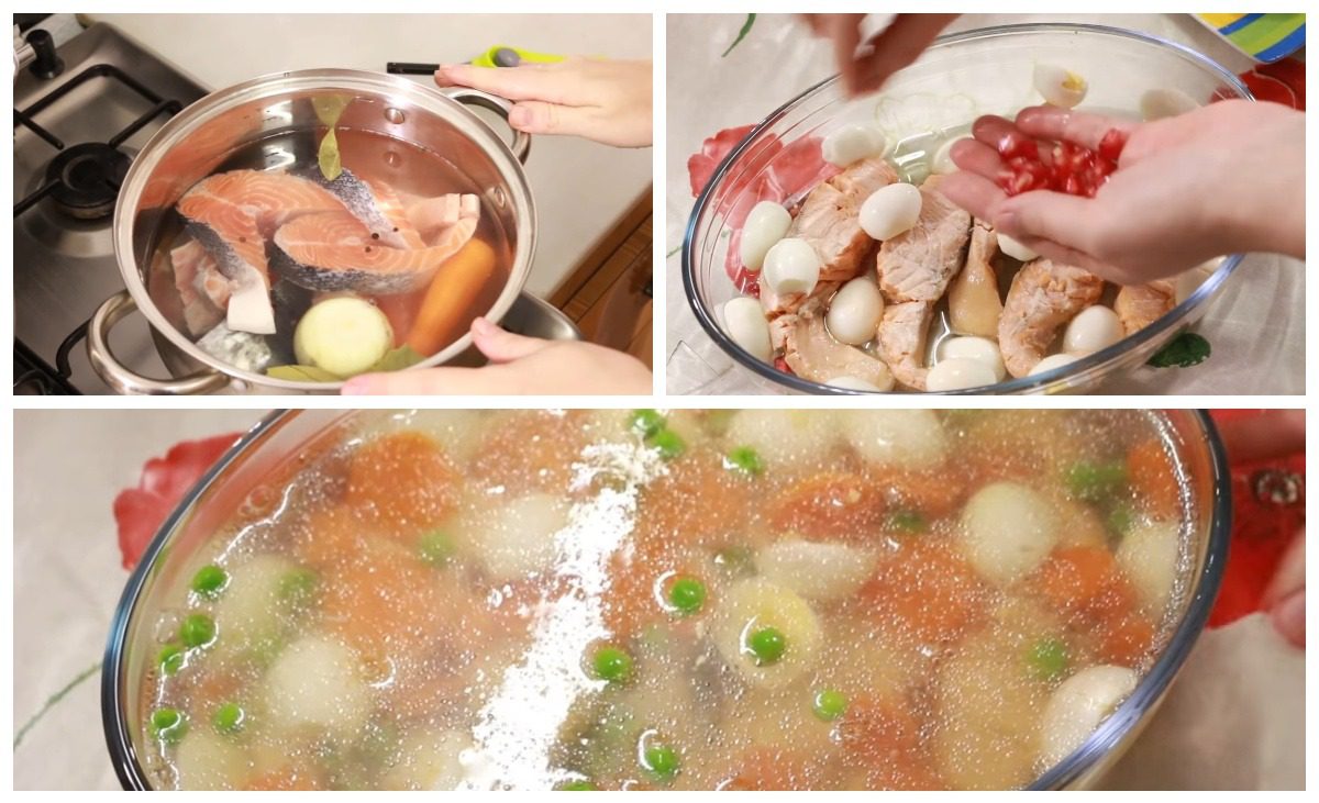- Розчиніть у воді желатин, а потім поєднайте його з бульйоном.