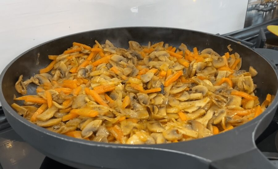 Печериці миємо та нарізаємо тонкими пластинками. Обсмажуємо гриби на пательні. Спочатку перекладаємо їх на суху пательню. Гриби почнуть випускати вологу, коли вся рідина випарується, додаємо до них олію, сіль, перець та паприку. На цьому етапі додаємо до грибів цибулю нарізану тонкими четверть кільцями. Смажимо гриби з цибулею 5 хвилин на середньому вогні. Далі додаємо на сковорідку моркву. Її треба нарізати тонкою соломкою. Смажимо гриби з овочами до м’якості моркви. Далі гриби з овочами треба охолодити.