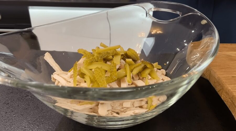 Варені яйця нарізаємо крупним кубиком, куряче філе ріжемо соломкою. Мариновані огірки також нарізаємо соломкою. Всі інгредієнти перекладаємо у салатник.