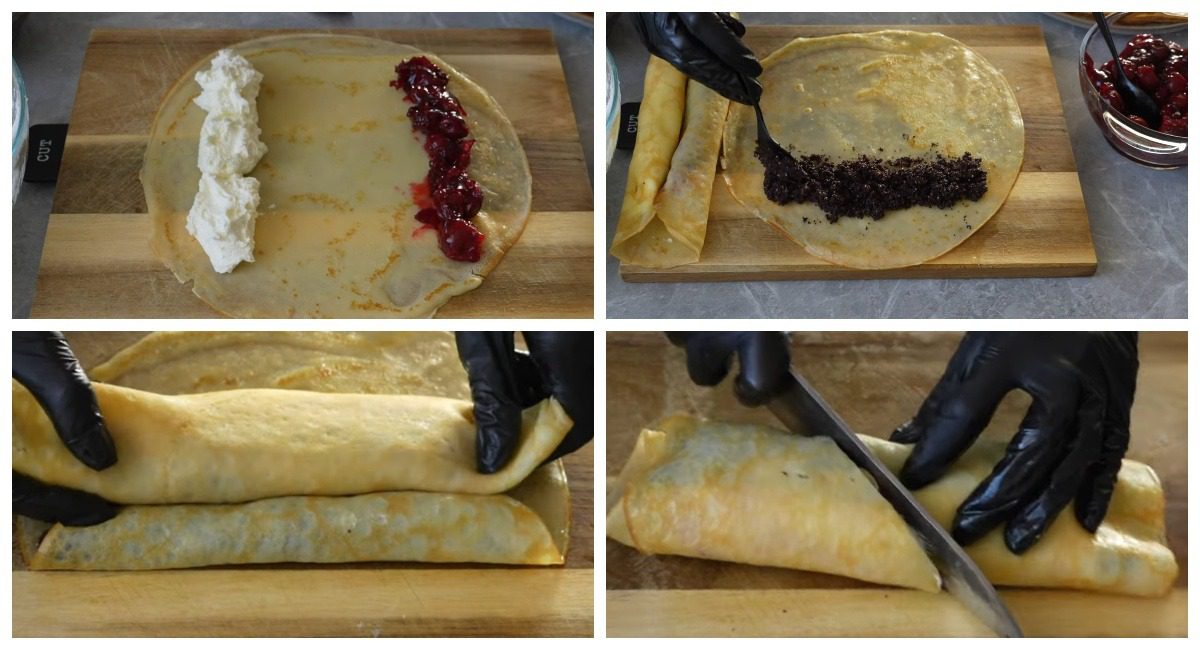 - На один млинець з одного боку покладіть смужкою сирну начинку, а з другого — вишневу. Загорніть начинки до центру.