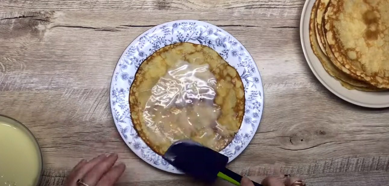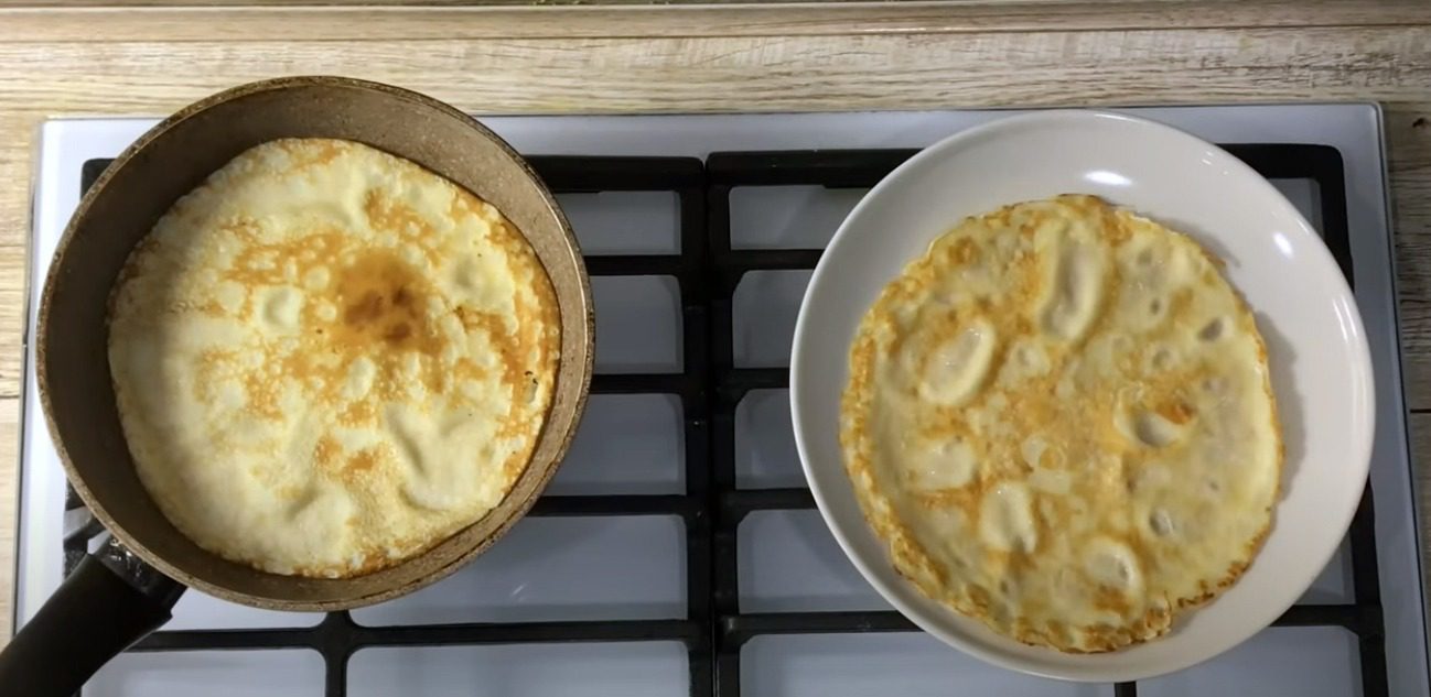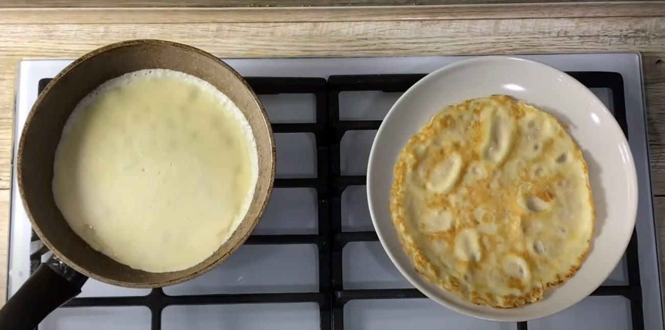 Поставте пательню на вогонь. Змастіть олією перед першим млинцем. Далі продовжуйте випікати млинці без жиру. Підсмажуйте їх з обох боків до рум’яності. Готовим виробам дайте повністю прохолонути.