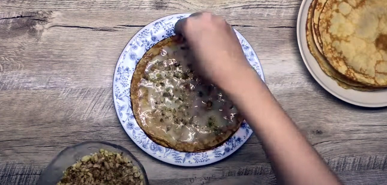 Змастіть млинці згущівкою та присипте подрібненими горіхами й викладіть один на один. Зверху присипте подрібненими горіхами й викладіть половинки від цілих горіхів. Поставте Римський пиріг у холодильник мінімум на 2 години. Коли просотається, його можна вживати.