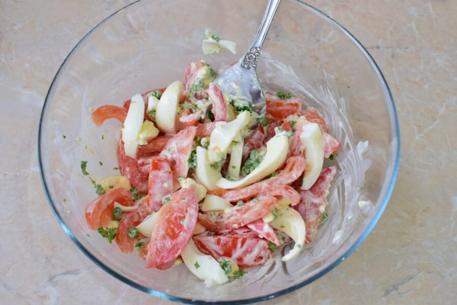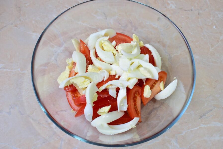 Почніть із того, щоб підготувати потрібні для салату інгредієнти. Варіть курячі яйця, а потім – перекладіть їх у холодну воду, щоб вони повністю стали холодними. Наступним кроком наріжте варені яйця на невеликі кубики. Помийте помідори та наріжте їх на кубики або часточки. Потрібно, аби розмір нарізаних шматочків яйця та помідорів був приблизно однаковим.