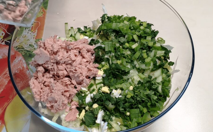 Яйця потрібно зарання відварити вкруту і охолодити. Нарізаємо яйця кубиком. Пекінська капусту (або салат айсберг) нарізаємо тонкою соломкою і перекладаємо в салатник. Огірок ріжемо соломкою і додаємо до капусти з яйцями. Туди ж додаємо консервований тунець. З консервованого тунця зливаємо всю рідину, а саму рибку розділяємо на шматочки. Також в салат дрібно ріжемо зелень. Ідеально підійдуть кріп, петрушка, зелена цибуля.
