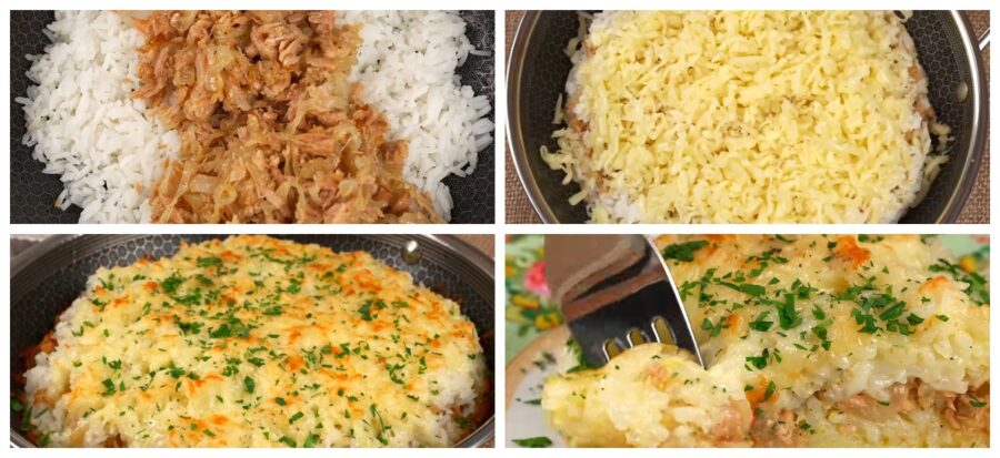- Тепер у форму для випікання покладіть половину рису, зверху — тунець з цибулею, потім накрийте шаром залишків рису. Залийте запіканку заливкою. Розкладіть по поверхні шматочки масла й посипте сиром.