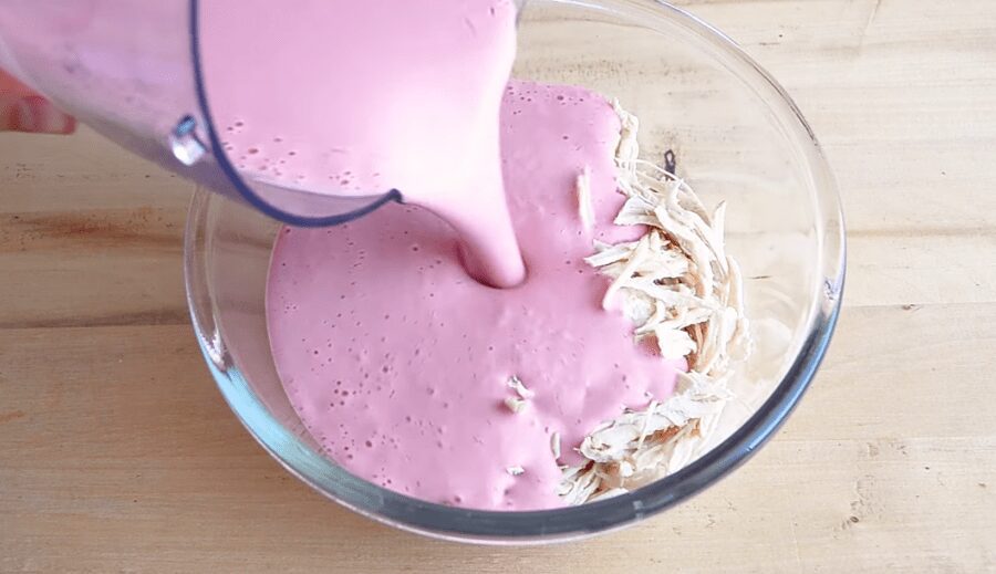 Іншу частину м’яса нарізаємо у вільній формі і перекладаємо у чашу блендера. Набухший желатин розтоплюємо у мікрохвильовці і виливаємо до м’яса у блендер. Туди ж додаємо буряковий сік, який слугує природним фарбником, другу половину бульйону (150 мл), а також додаємо сіль, перець та мускатний горіх. Збиваємо все у блендері до однорідності.