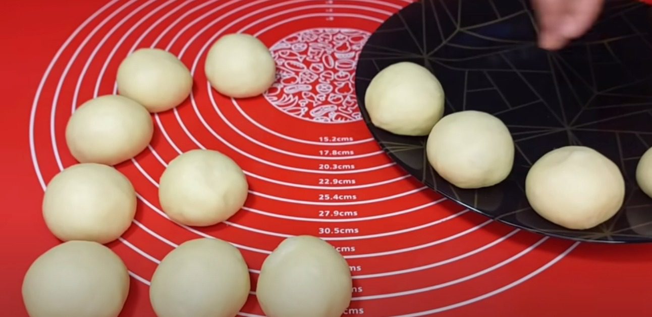 Вимийте руки, полийте долоні олією та на чистій від борошна дошці змастіть ковбик тіста. Покладіть його до миски. Накрийте харчовою плівкою і залиште на 30 хвилин у теплому місці.