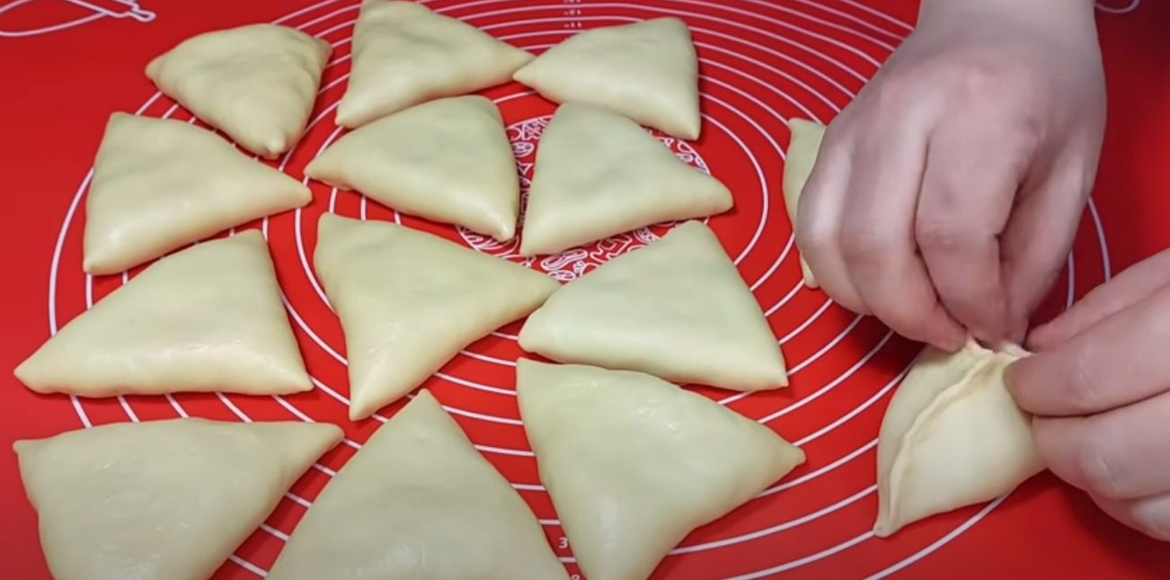 Знову змочіть долоні в олії. Викладіть тісто на робочу поверхню, змащену олією. Злегка обімніть і розділіть на кульки завбільшки з волоський горіх. Розплескайте руками, додайте м’ясну начинку та защипніть краї, щоб вийшли трикутнички.