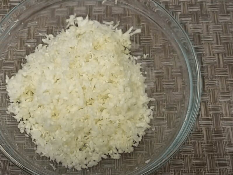 Капусту потрібно дуже дрібно подрібнити. Якщо ви використовуєте зимову білу капусту, можна її натерти на крупну тертку. Якщо ви берете молоду капусту, то просто наріжде її дрібно ножем.