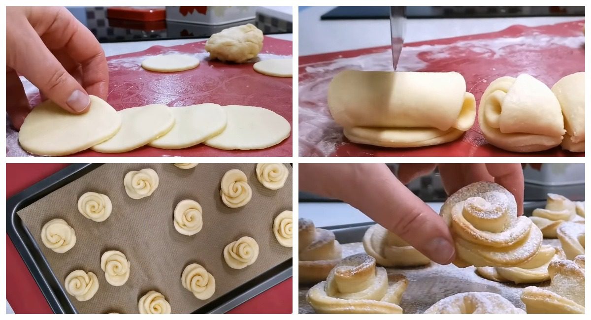 Складіть кружечки по 4 штуки в на хльост та загорніть їх рулетиками. Потім кожен рулетик розріжте навпіл. Заліпіть їх знизу та розкладіть на деко. Руками розправте імпровізовані пелюстки.