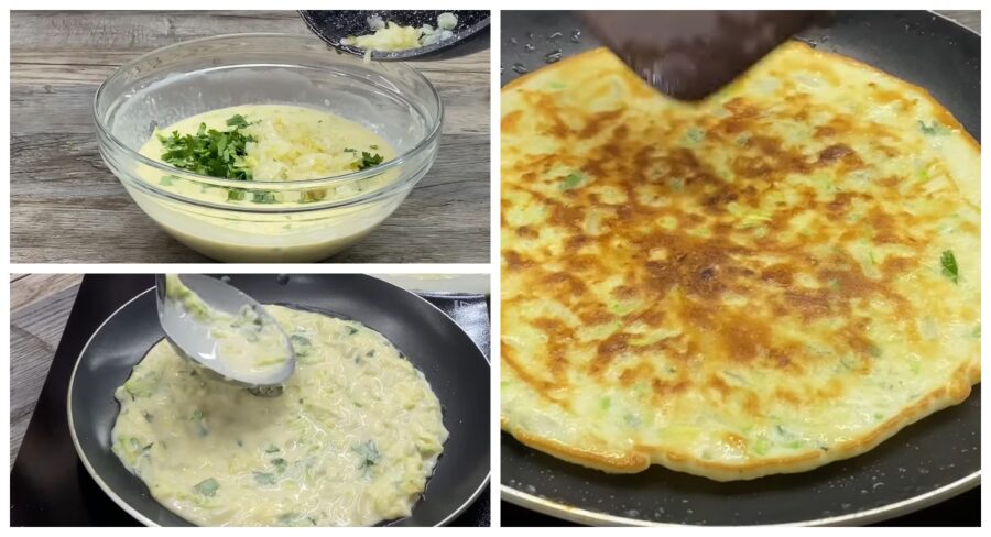 У тісто покладіть відтиснуті від рідини кабачки й картоплю, охолоджену цибулю, а також нашатковану зелень. Все добре перемішайте та випікайте на змащеній рослинною олією сковорідці млинці у звичайний спосіб.