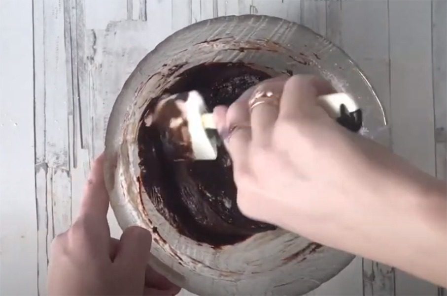 Змішайте обидві суміші. Збийте ще раз міксером до однорідності. Борошно змішайте з розпушувачем. Просійте і додайте в шоколадну суміш. Перемішайте силіконовою лопаткою. Тісто має вийти в’язким, але не дуже щільним.