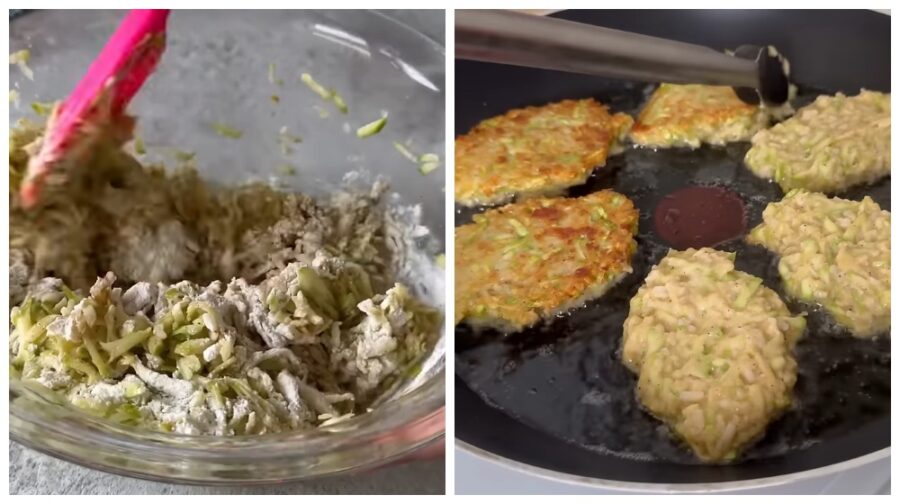 Тепер поєднайте теплий рис з кабачками, яйцем, натертим сиром та борошном, утворюючи таке “тісто для оладок”
