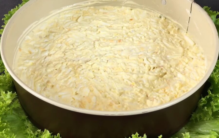 Курячі яйця заздалегідь зваріть круто і потім остудіть. Далі їх потрібно буде почистити й натерти, потім також викласти в салат – так у вас вийде четвертий шар. Тепер до всього цього додайте сіль за смаком. Тепер яєчний шар полийте майонезом.