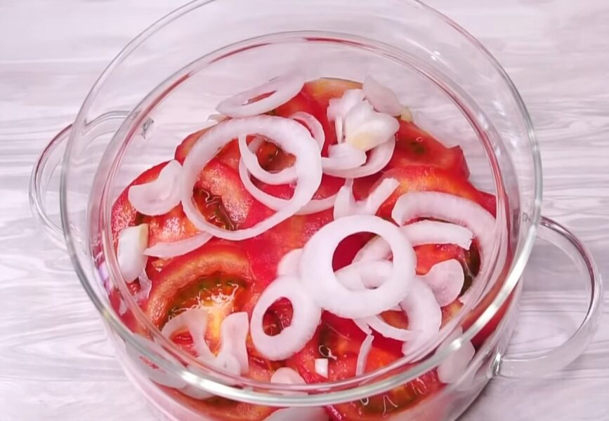 Для початку очистіть цибулю від шкірки та промийте у воді разом з іншими овочами. Зріжте кришечку з болгарського перцю та очистіть його від насіння. Можна замінити болгарський перець перцем чилі, але тоді видаляти насіння потрібно, діючи в рукавичках, оскільки воно дуже гірке і може навіть обпекти долоні. Потім наріжте цибулю і перець дрібними кубиками. Подрібніть усе це в пюре за допомогою блендера.