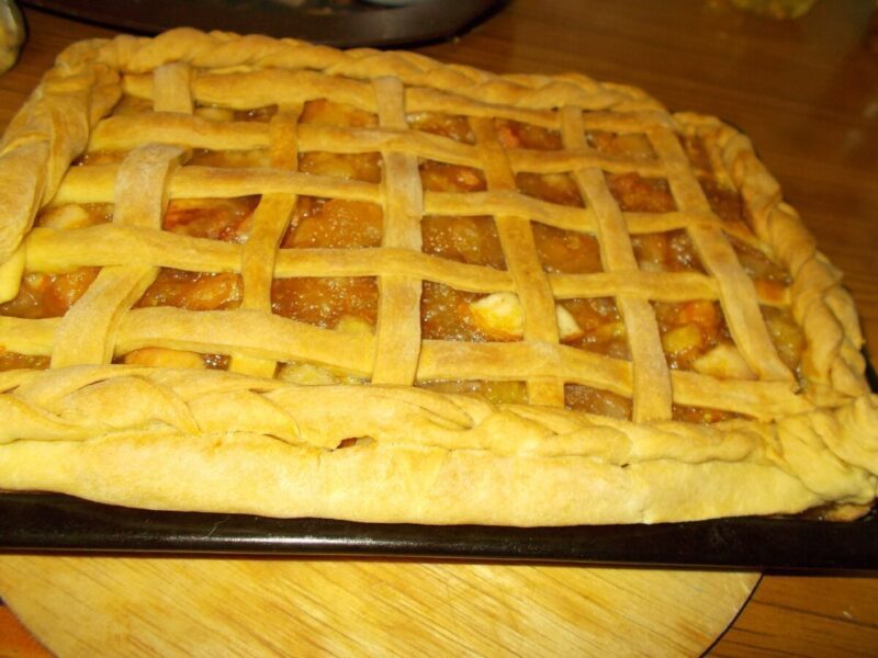 Викладіть верхівку пирога – заплетіть зі смужок красивий візерунок. Випікайте пиріг у попередньо розігрітій духовці протягом 30-40 хвилин. Після приготування дайте пирогу трохи охолонути перед подачею.