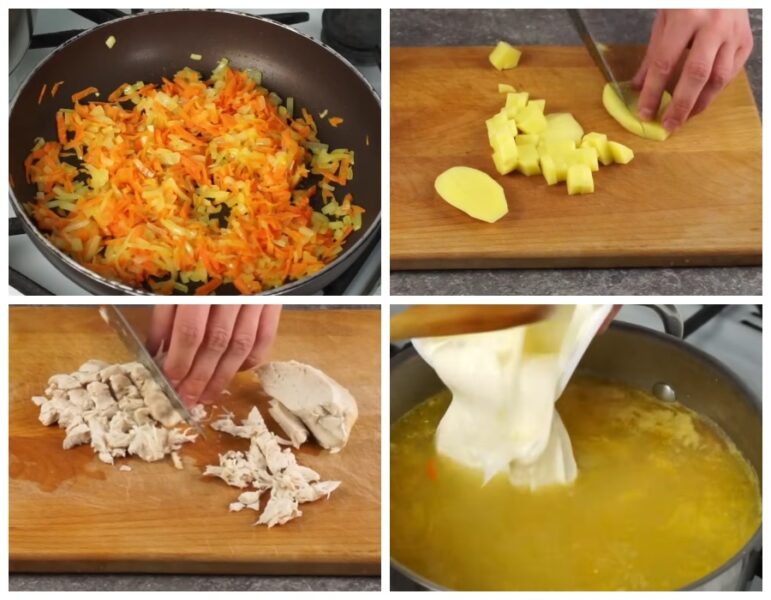 Моркву очистити, натерти на грубій тертці та додати до цибулі. Тушкувати овочі протягом кількох хвилин. Очистити та нарізати картоплю невеликими кубиками, як на фото. У кип’ячий бульйон додати підготовлену картоплю і овочеву засмажку. Нарізати відварену курячу грудку невеликими шматочками та перекласти в каструлю до всіх інгредієнтів. Туди ж додати плавлений сир, перемішати та залишити варитися.