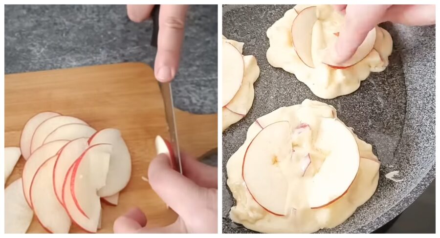 На розігріту у сковорідці олію викладайте ложкою тісто, формуючи оладки. Зверху розкладайте яблучні слайси.
