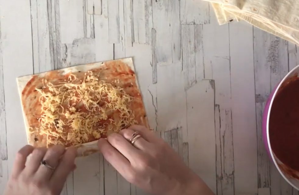 Сир натріть на середній тертушці. Лаваш розріжте на однакові прямокутники. Має вийти 6 штук. Кожен шматочок лаваша змастіть томатним соусом. Зверху присипте тертим сиром. Загорніть рулетиком.