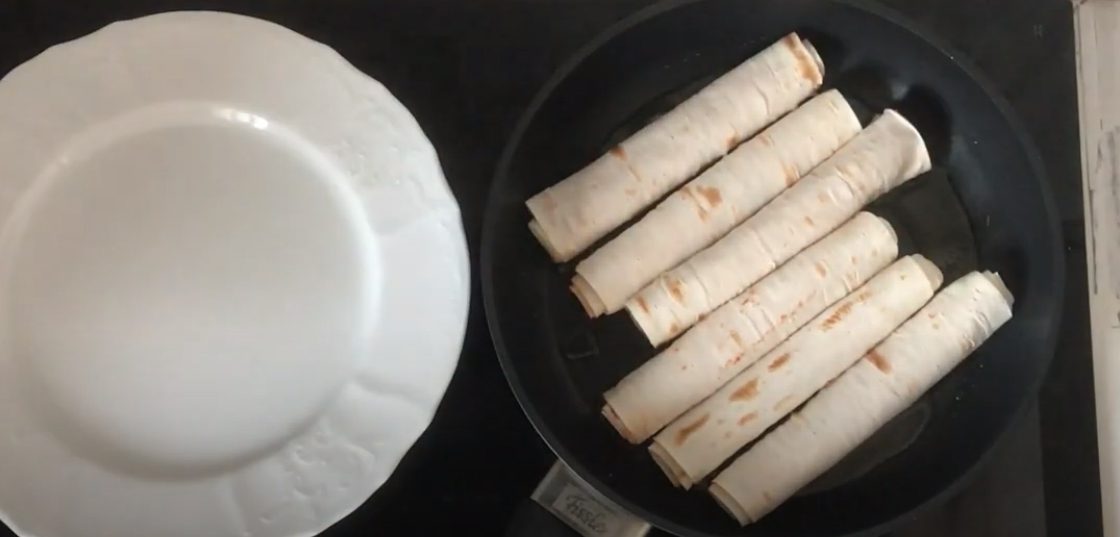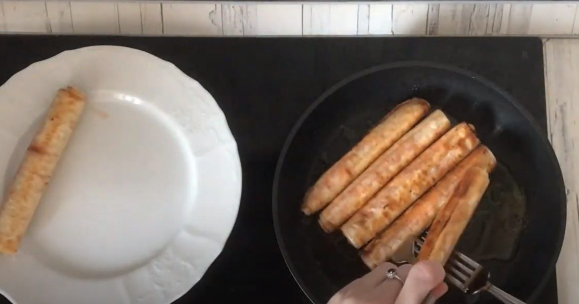 У пательню влийте олію та розігрійте на вогні. Викладіть трубочки швом донизу. Смажте близько 5 хвилин з одного боку. Має з’явитися рум’яна скоринка. Переверніть рулети з сиром і підсмажте до готовності з іншого боку. На це піде десь 3 хвилини.