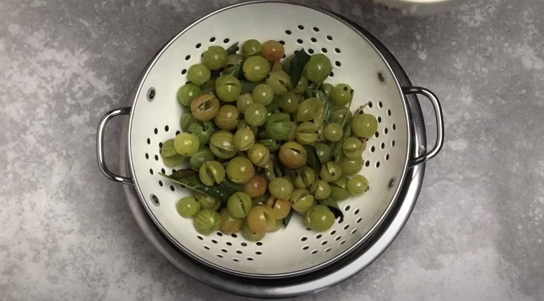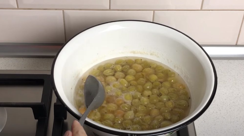 Після закипання проваріть 2 хвилини. Додайте аґрус разом із листям. Вогонь вимкніть. Залиште на 2-3 години. Подібна методика дозволить плодам зберегти колір, не розваритися та рівномірно просочитися сиропом.