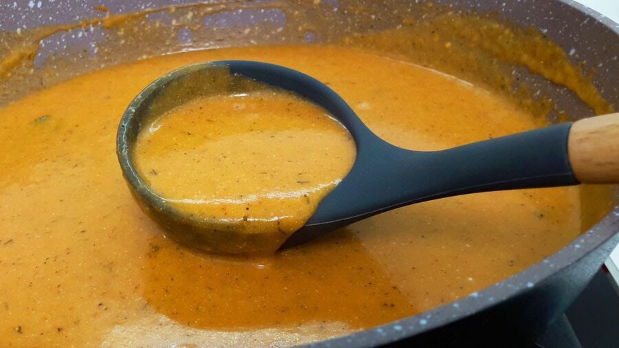 Додайте сіль, чорний перець, паприку і сушені трави за смаком. Продовжуйте варити ще 1-2 хвилини, щоб спеції вбилися в смак підливи. Нарешті, додайте сметану і добре перемішайте до однорідності. Дайте підливі ще один раз закипіти, потім знизьте вогонь і готуйте ще 1-2 хвилини.