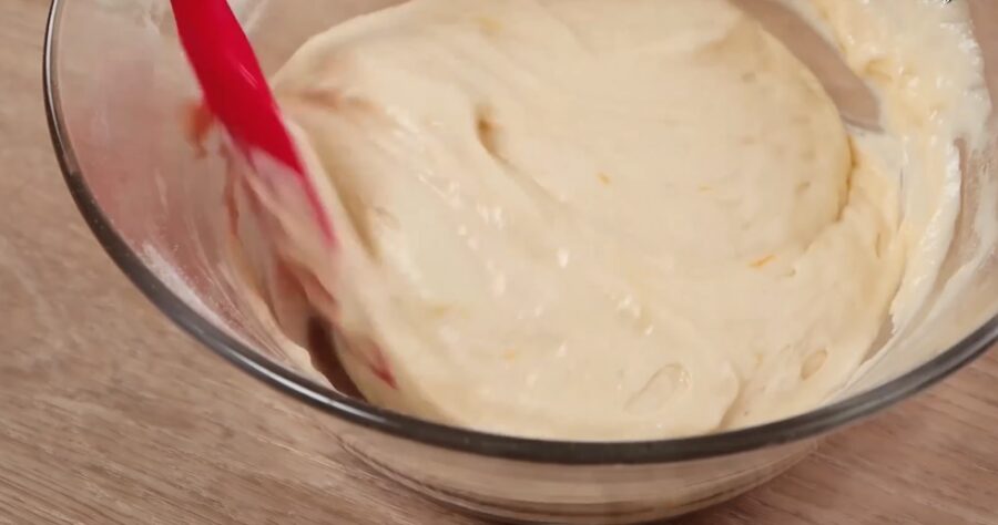 Далі до рідких інгредієнтів у два прийома засипаємо просіяне борошно та розпушувач тіста. Вінчиком замішуємо однорідне тісто без грудочок. З одного лимону вичавлюємо сік, а також натираємо цедру цього лимону. Сік та цедру додаємо в тісто і знову ретельно перемішуємо.