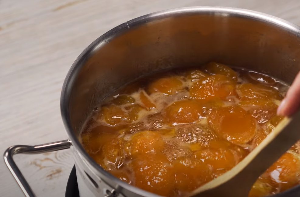 Наступного дня дістаньте. Абрикоси встигли дати сік. Поставте на середній вогонь. Коли маса закипить, варіть пів години, легенько помішуючи та постійно знімаючи пінку, що утворюється.