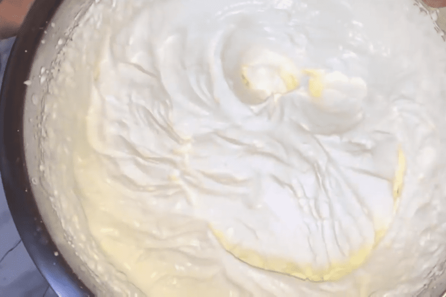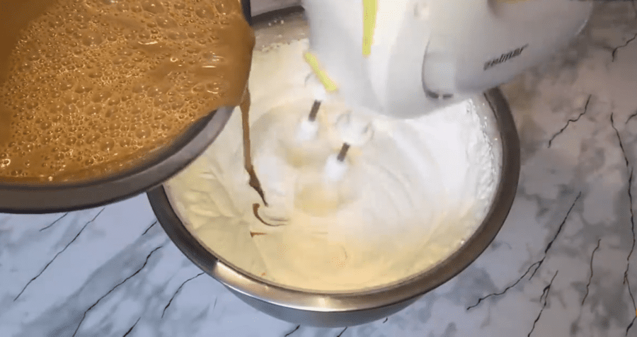 Далі додаємо отриману карамельну суміш у збиті вершки порціями і збиваємо міксером на малих обертах.