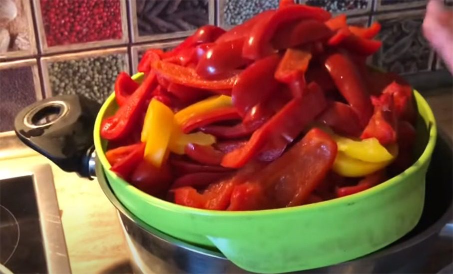 Тепер настала черга підготувати перці. Бажано брати овочі різних кольорів. Промийте їх під краном. Видаліть насіння та перегородки. Наріжте продовжними часточками. Відправте у маринад. Прокип’ятіть 10 хвилин.