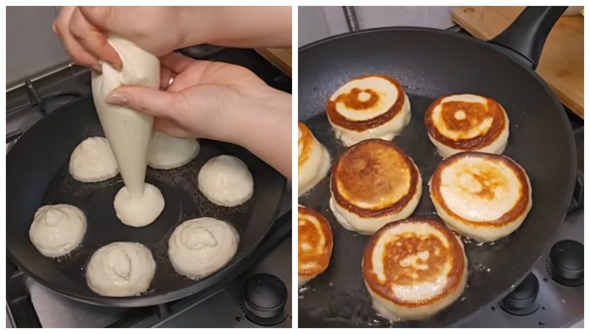 Ложкою або за допомогою кулінарного кулька викладайте порції тіста на сковорідку. Не розмазуйте його — нехай воно саме “збереже” свою форму. Смажте до золотистого кольору з обох боків.