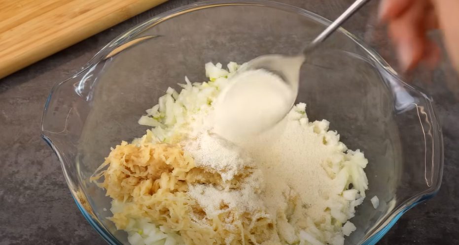 Змішайте овочі. Додайте манну крупу та сіль. Перемішайте руками й залиште на 15 хвилин, щоб манка набубнявіла, а заразом всотала цибулевий та картопляний сік. Після цього сформуйте котлети.