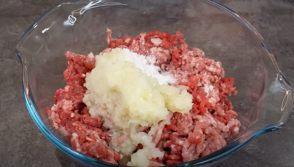 Після цього туди ж відправте дві цибулини. У фарш додайте сіль, чорний мелений перець та всипте панірувальні сухарі. Залийте воду й дайте трішки постояти, щоб хлібні вироби набубнявіли. Все ретельно перемішайте. Якщо фарш видається сухуватим, додайте ще трішечки води.