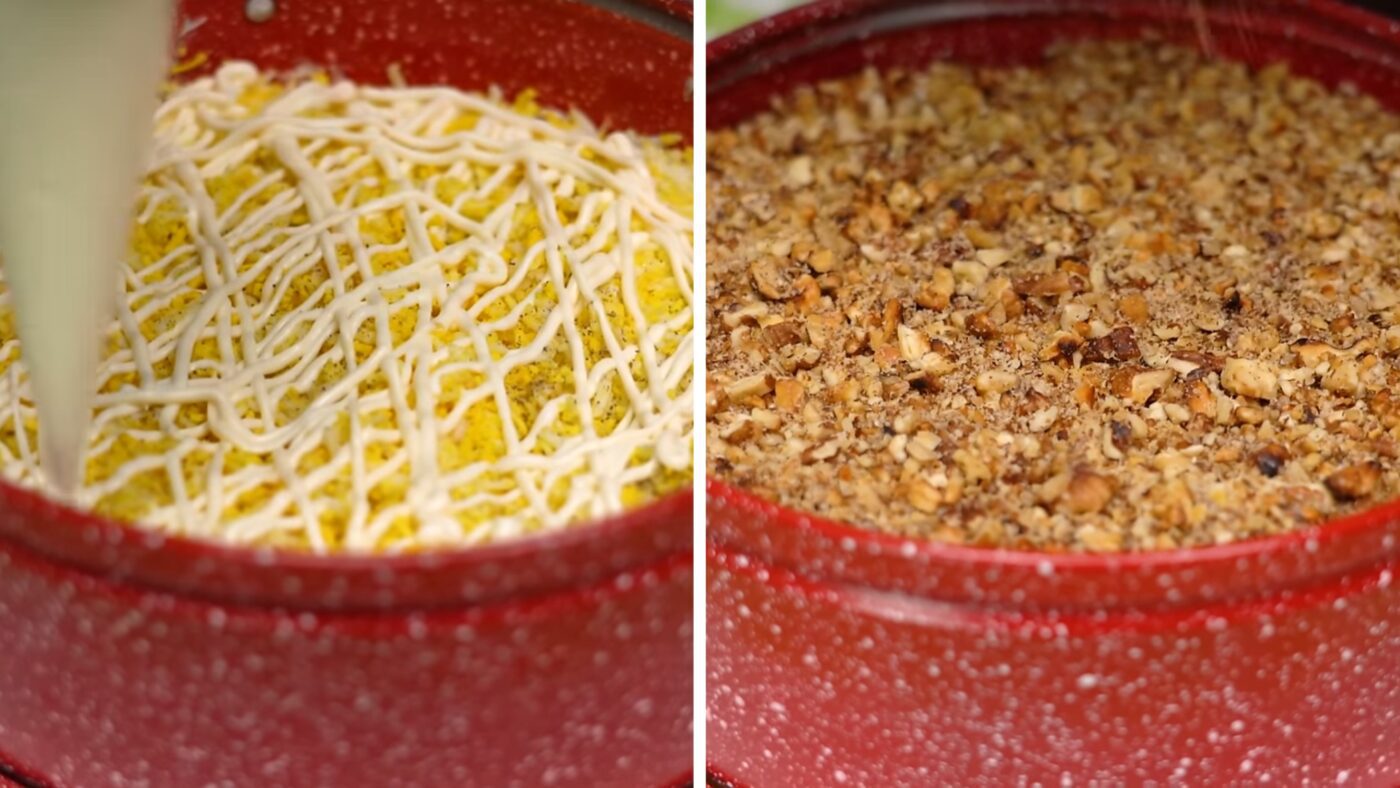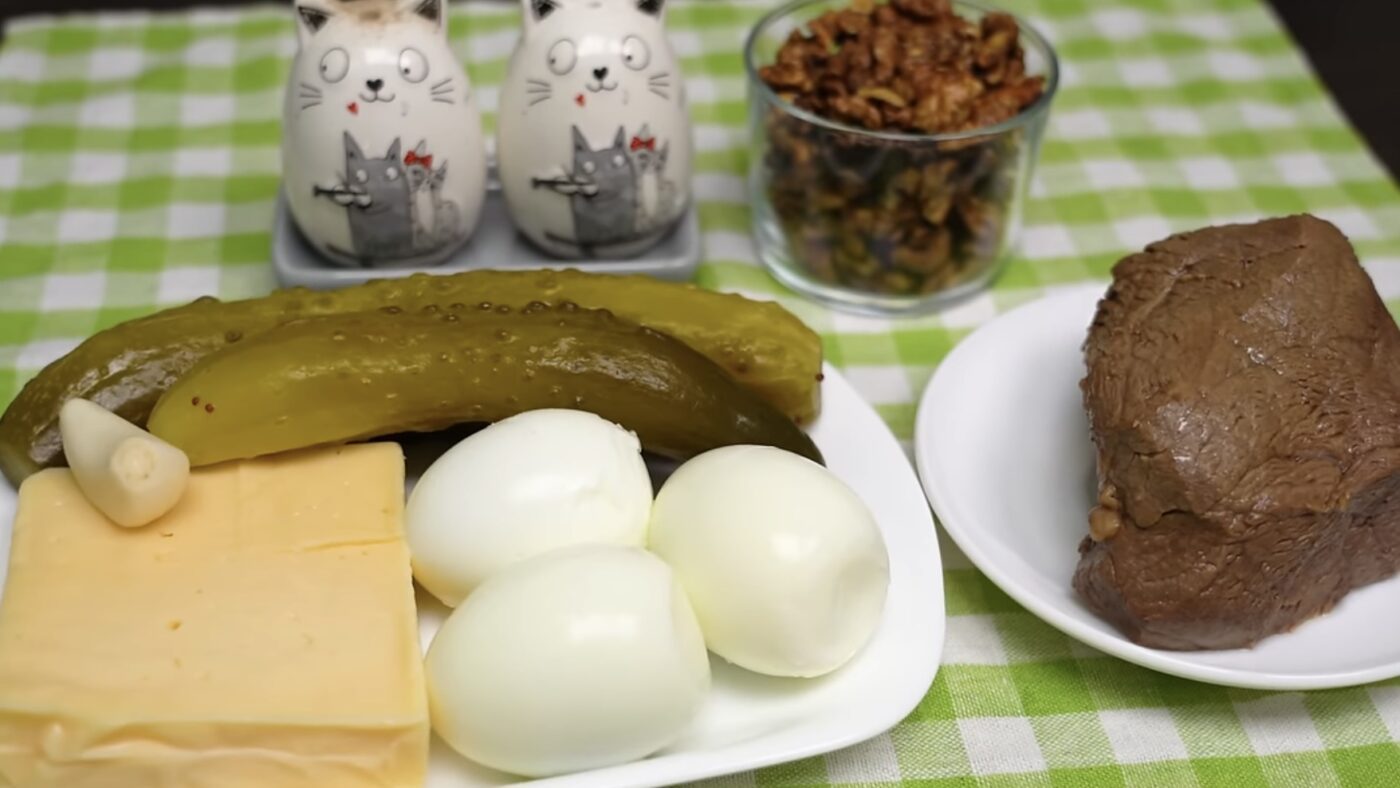 Спочатку потрібно відварити м’ясо до готовності, дати йому охолонути й нарізати дрібними шматочками або розібрати руками на волокна. Це буде перший шар. Викладаємо його на дно глибокої салатниці або розʼємної форми і злегка змащуємо майонезом.