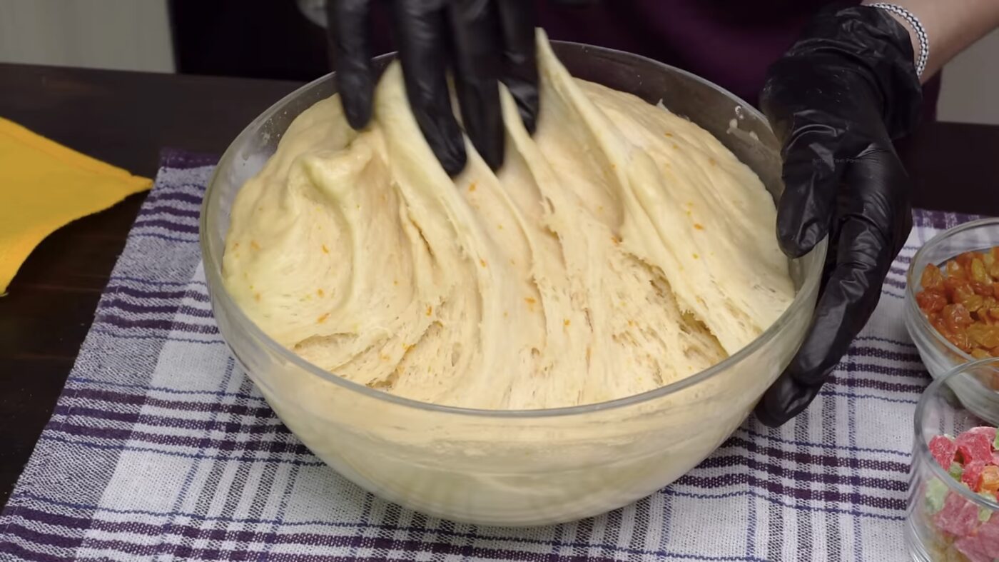 У великій мисці взбийте яйця з цукром до легкої піни. Додайте сіль, мед, ваніль, цедру апельсина, підняту опару і перемішайте. Потроху додавайте борошно, замішуючи тісто. Коли маса стане густішою, добавляйте мʼяке масло. Місіть тісто 10–15 хвилин — воно повинне бути м’яким, еластичним, не липнути до рук. Потім додайте сухофрукти.