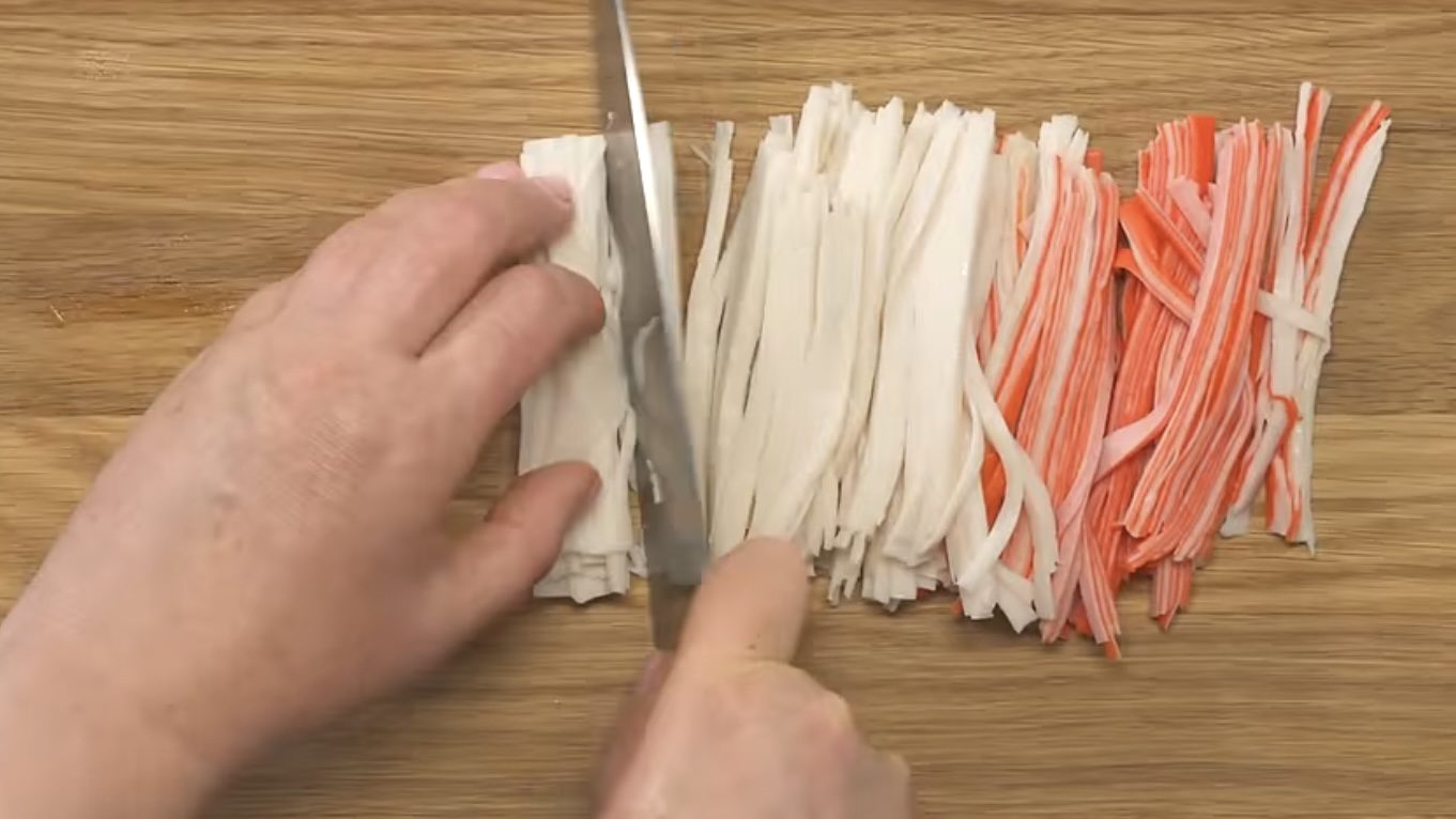Крабові палички також ріжуться тонкою соломкою. Якщо вони були в морозилці — обов’язково дати їм добре розтанути, щоб не було зайвої вологи. Сир вибирається будь-який твердий — головне, щоб добре тримав форму при натиранні. Часник натирається також на дрібній тертці або просто подрібнюється ножем.