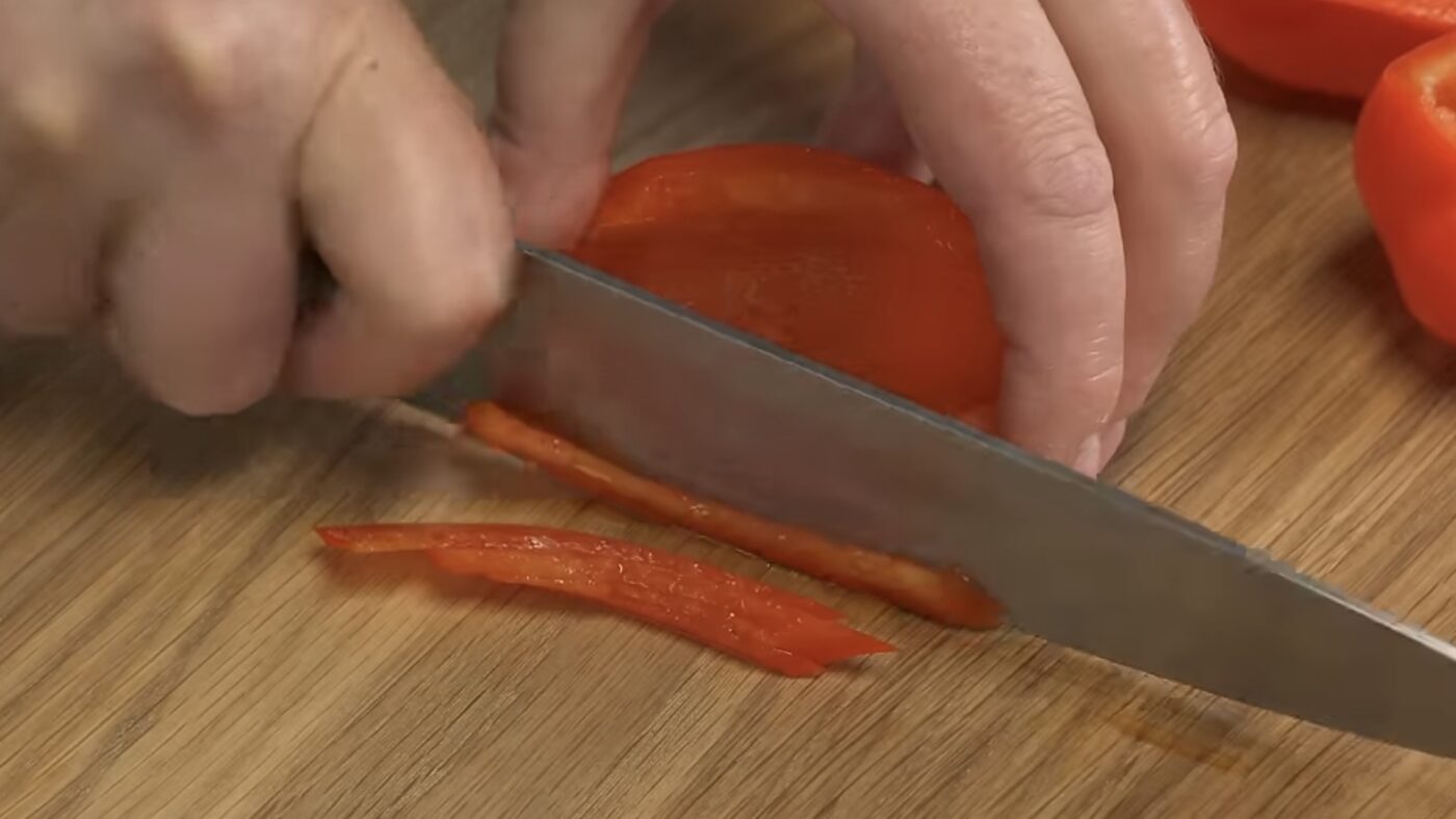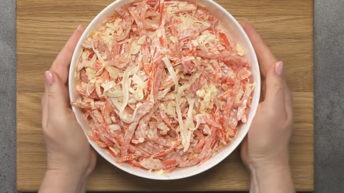 Усі овочі та крабові палички нарізаються соломкою. Болгарський перець краще взяти червоний — він солодший і гарно виглядає в салаті. Помідори мають бути стиглими, м’якими, але не водянистими — інакше пустять забагато соку.