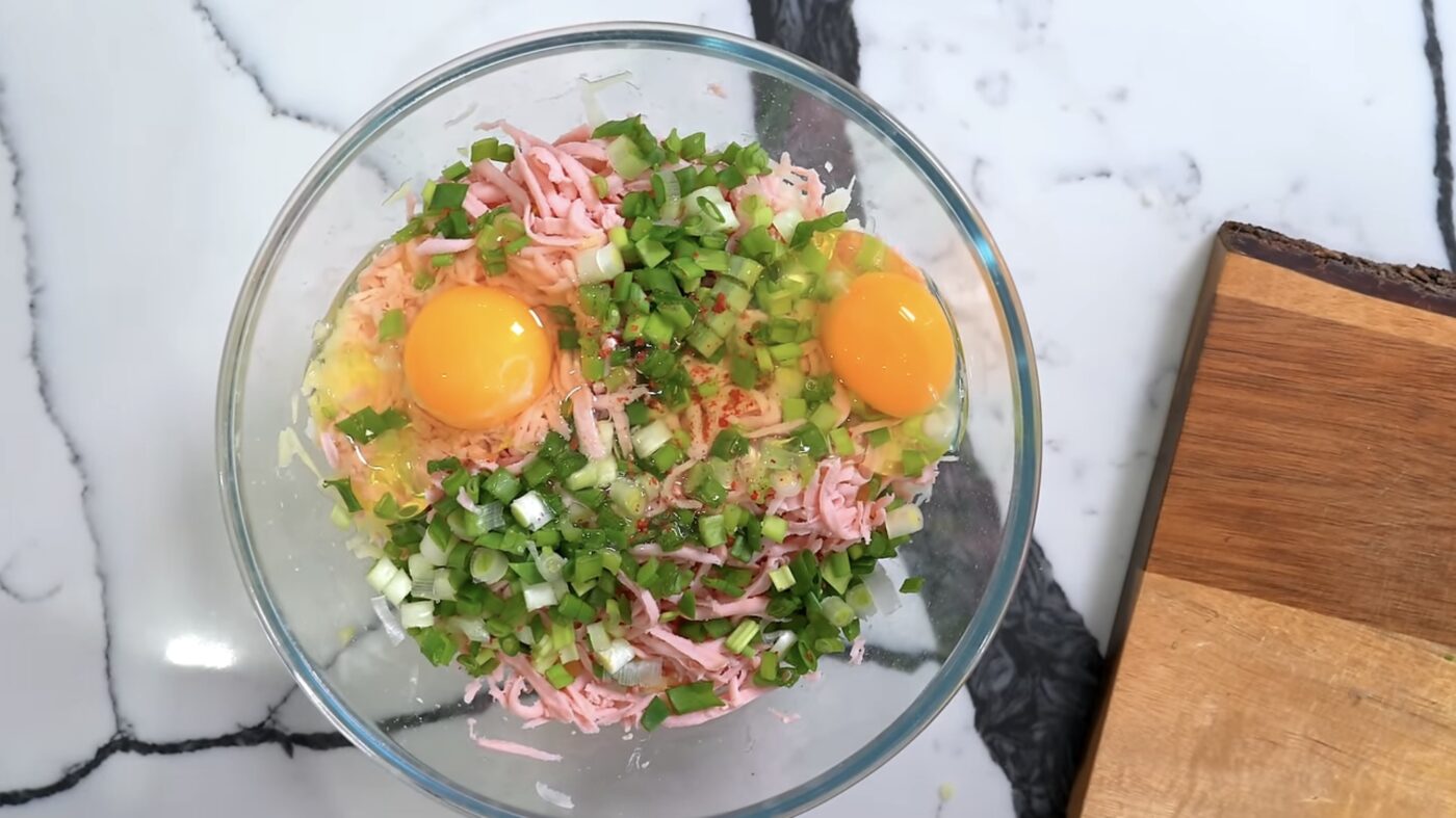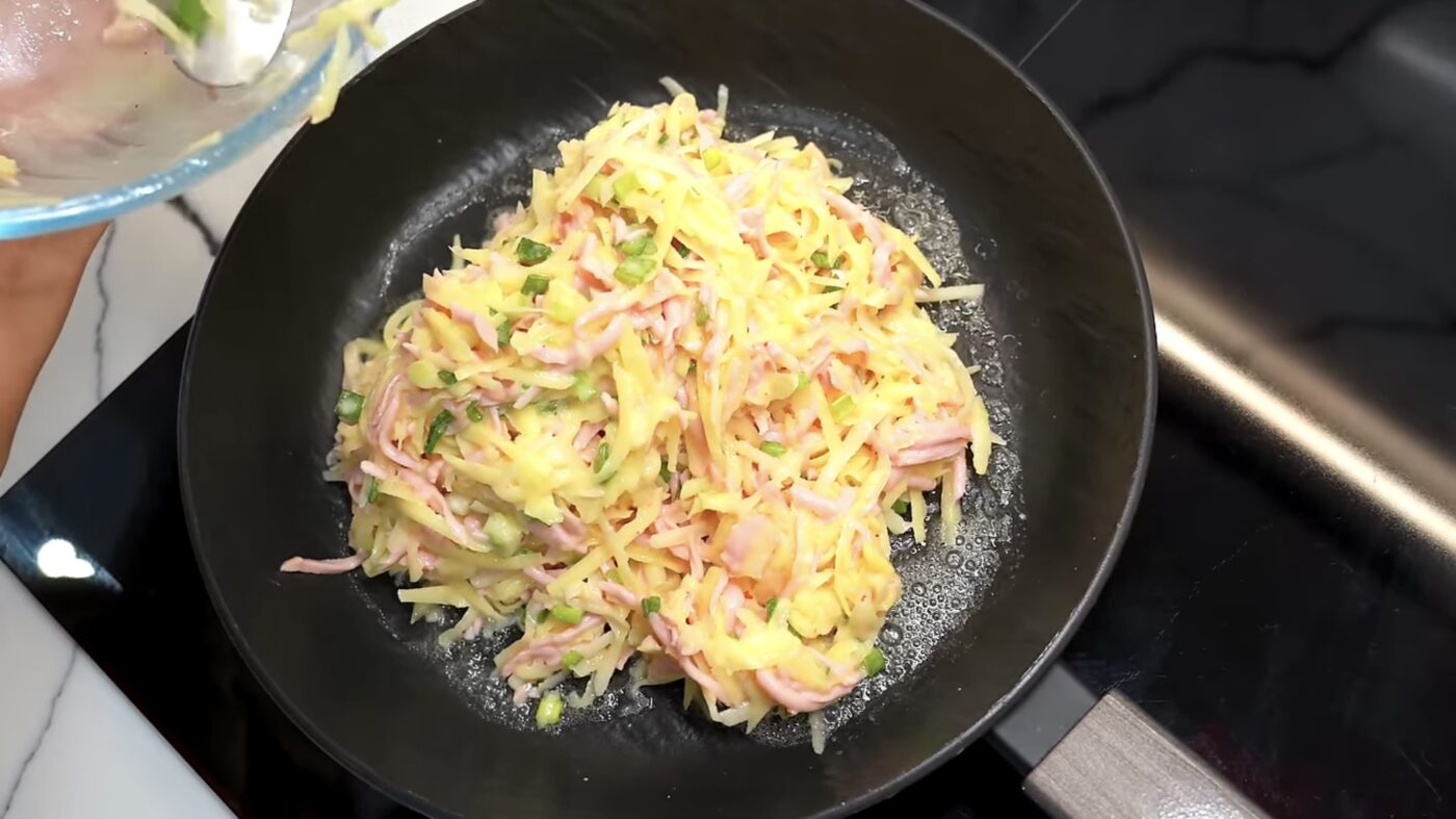 Очистіть картоплю та натріть її на великій тертці. Так само натріть ковбасу та сир. Зелену цибулю дрібно наріжте. Складіть усі інгредієнти у велику миску — картоплю, ковбасу, сир, зелень. Додайте яйця, сметану або майонез, борошно, сіль і перець. Добре перемішайте — маса має бути густою, але не надто сухою.