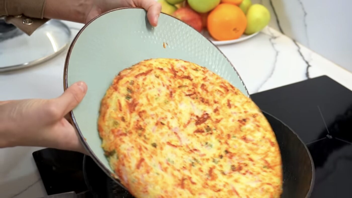 Щоб перевернути страву й не пошкодити її, зніміть сковорідку з плити, накрийте великою тарілкою, переверніть, а потім обережно перекладіть назад на сковорідку вже обсмаженою стороною вгору. Знову накрийте кришкою і готуйте ще 12 хвилин.
