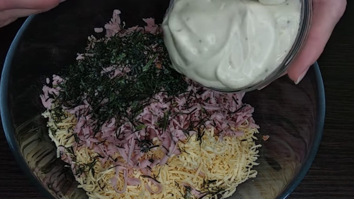 Спочатку натирається сир і ковбаса на великій тертці. Потім до цієї маси додається дрібно нарізаний кріп, трохи чорного перцю для пікантності та ложка-друга майонезу — все перемішується до однорідності.