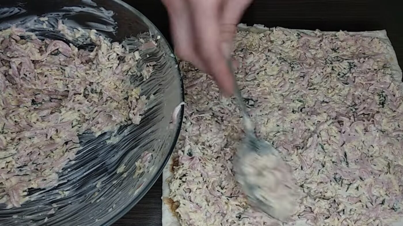 Отриману начинку викладають на лаваш, рівномірно розподіляють і щільно скручують у рулет. Рулет нарізають на порційні шматочки.